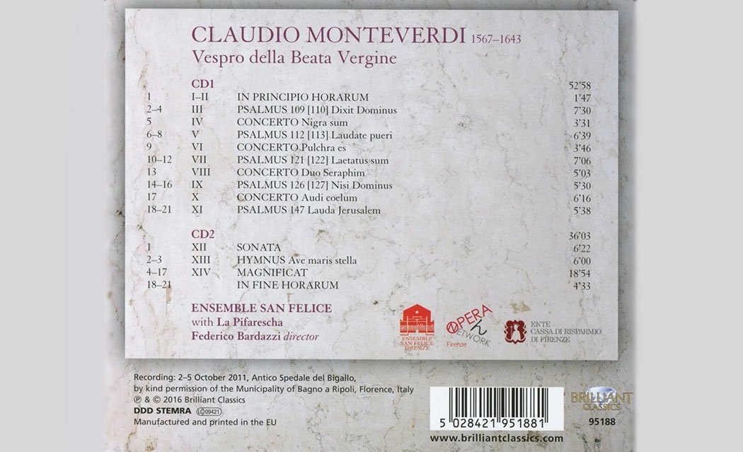 Monteverdi’s Vespers are performed regularly nowadays, and count among the iconic choral masterworks of the Renaissance/Baroque. This festive new recording by the Ensemble San Felice, conducted by Federico Bardazzi, features authentic instruments (cornettos and trombones!) and a line of excellent Italian vocal soloists.