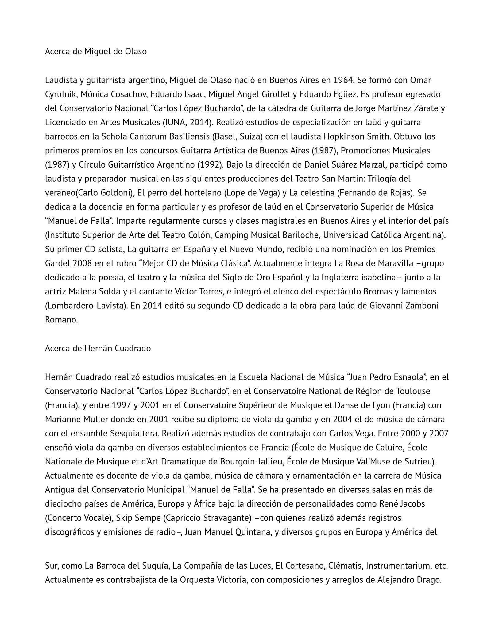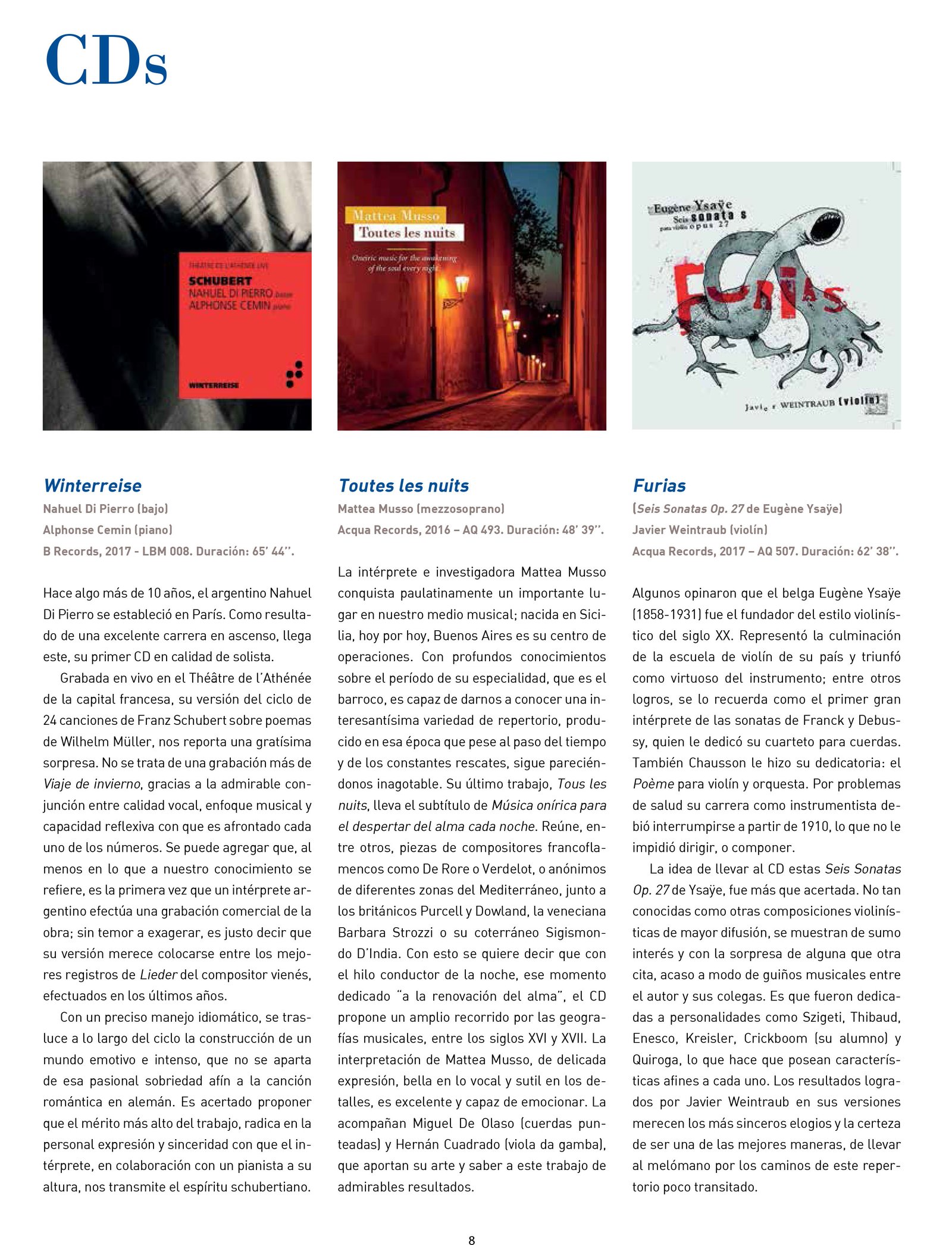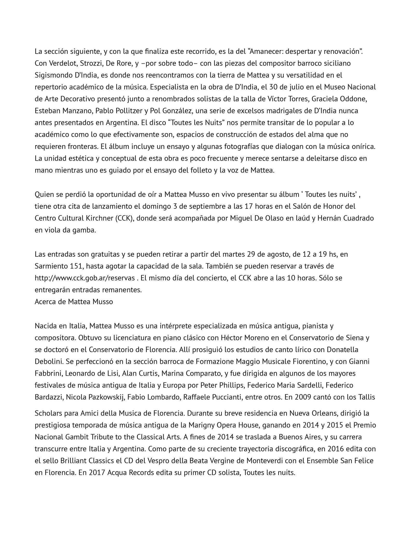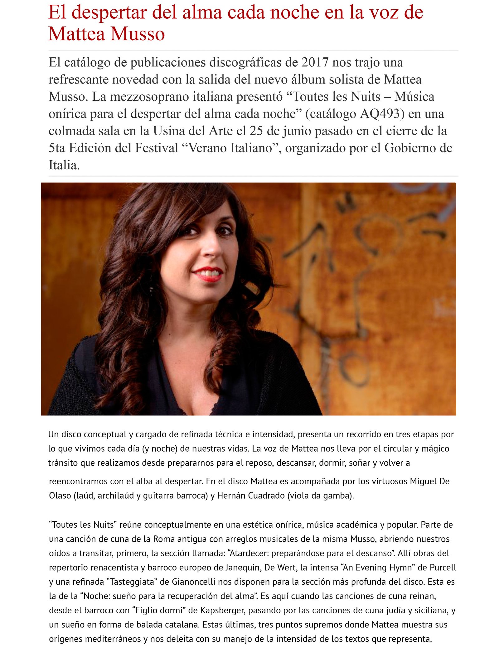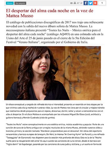 “Mattea Musso’s interpretation, expressed delicately, beautiful in the vocal and subtle in the details, is excellent and moving. She is accompanied by Miguel de Olaso (plucked strings) and Hernán Cuadrado (viola da gamba), who support her art and knowledge in this work to admirable results.”