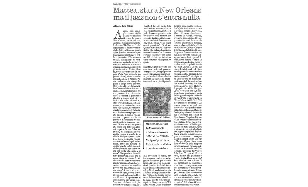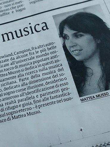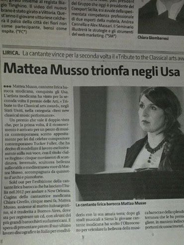 “(…) Salve Regina: cinque movimenti di scandinava, invernale, scultorea bellezza sulla calda e mediterranea voce di Mattea Musso … La giovane cantante modicana ha scelto l’oltreoceano per veicolare la bellezza della musica barocca e della splendida voce mediterranea che le ha permesso di raccogliere, in maniera indiscussa, i due importanti riconoscimenti”, Il Giornale di Sicilia (Italia).