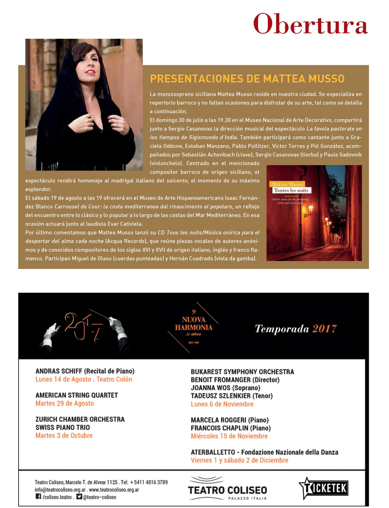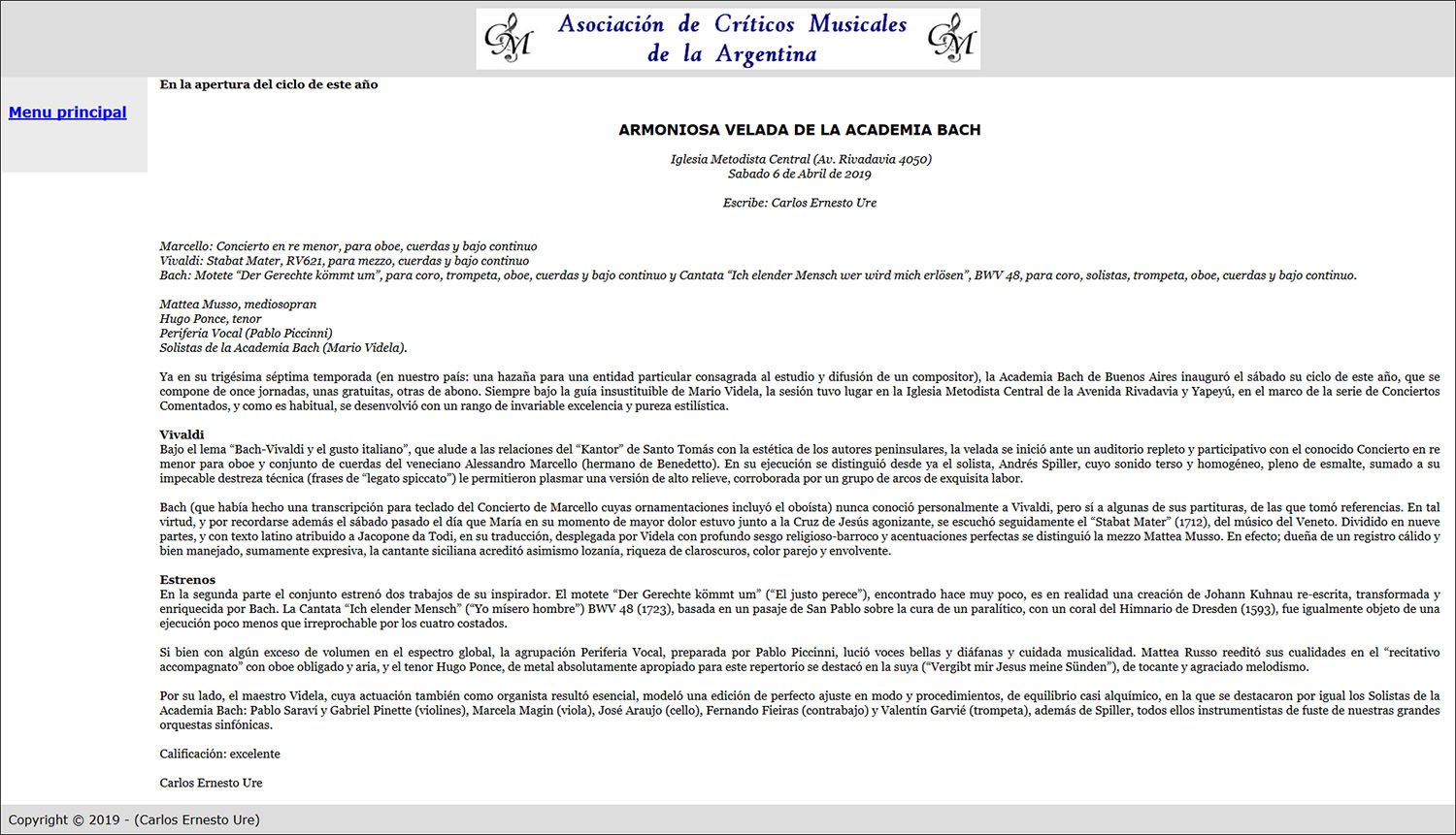 "Dividido en nueve partes, y con texto latino atribuido a Jacopone da Todi, en su traducción, desplegada por [Mario] Videla con profundo sesgo religioso-barroco y acentuaciones perfectas se distinguió la mezzo Mattea Musso. En efecto; dueña de un registro cálido y bien manejado, sumamente expresiva, la cantante siciliana acreditó asimismo lozanía, riqueza de claroscuros, color parejo y envolvente. (...) Calificación: Excelente."