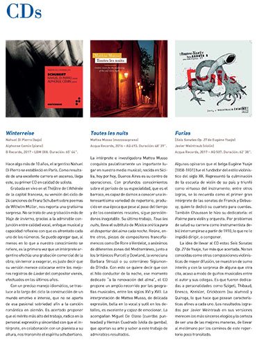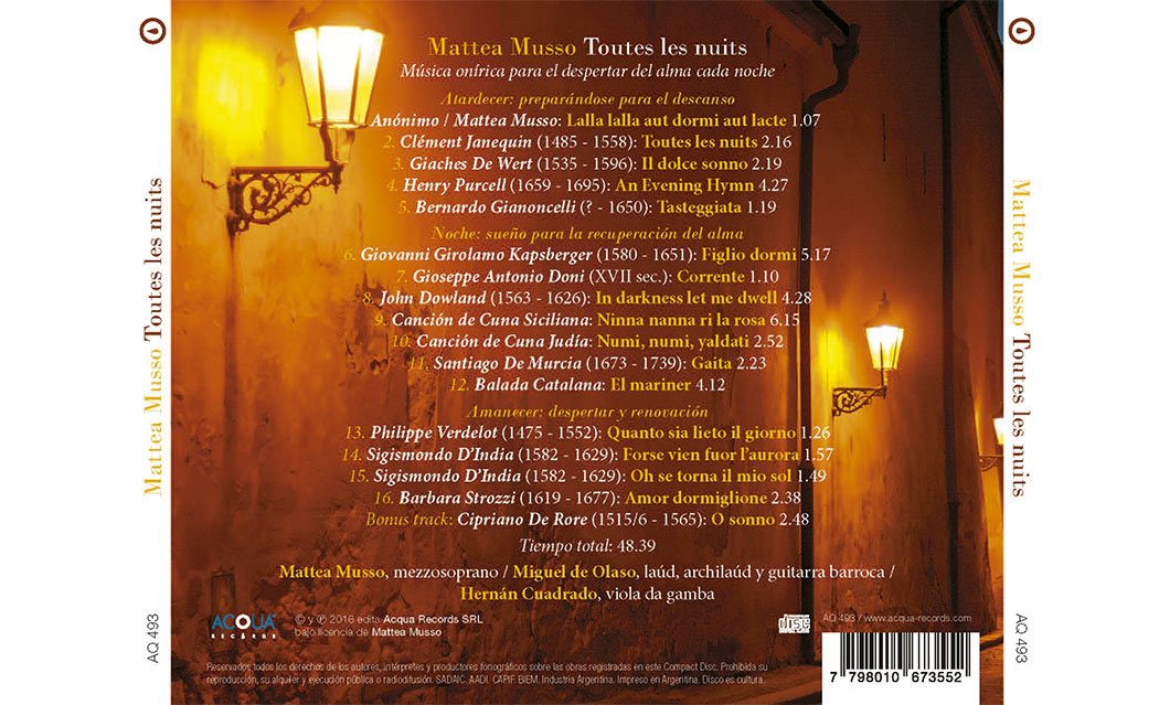 “Mattea Musso’s interpretation, expressed delicately, beautiful in the vocal and subtle in the details, is excellent and moving. She is accompanied by Miguel de Olaso (plucked strings) and Hernán Cuadrado (viola da gamba), who support her art and knowledge in this work to admirable results.”