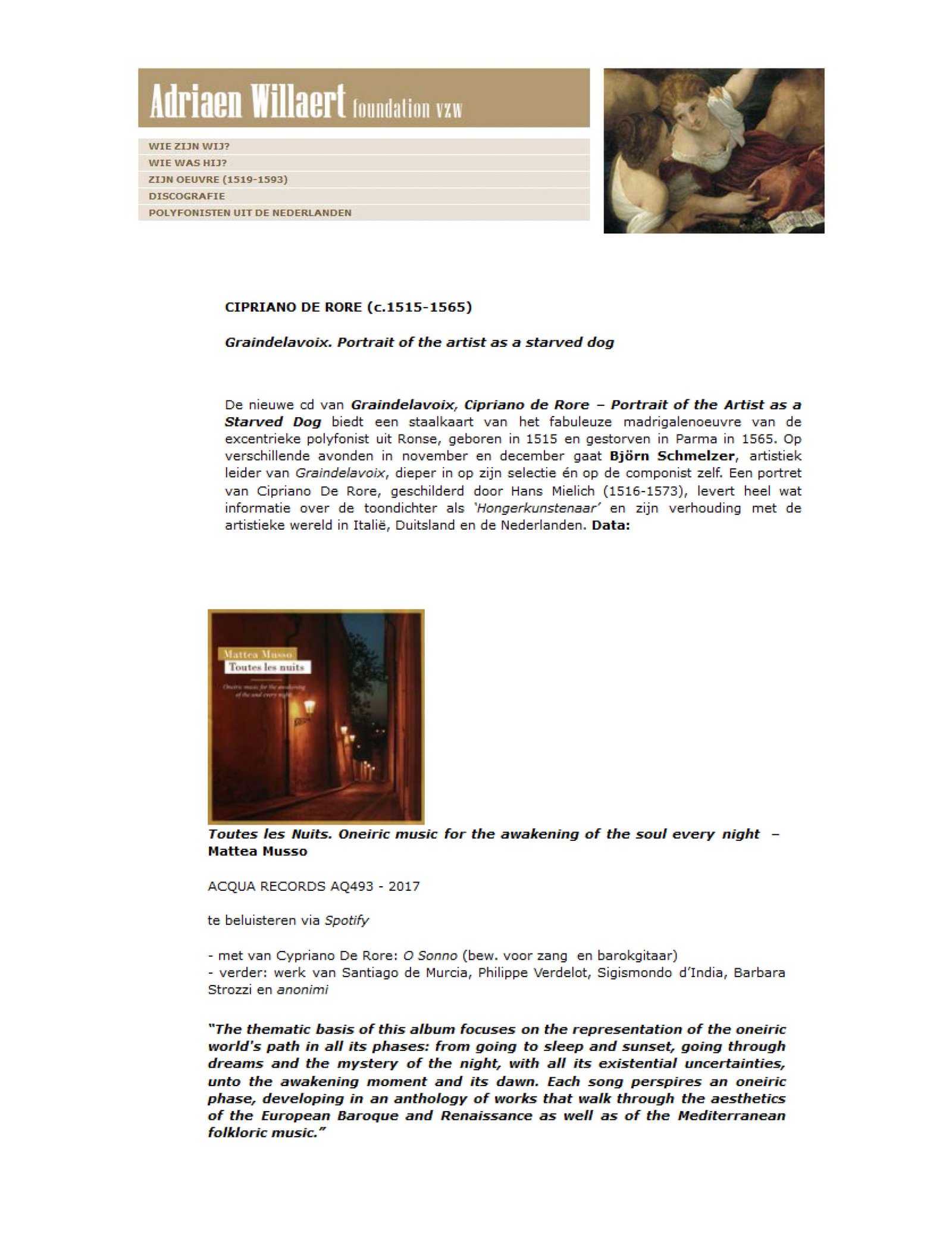 Un’antologia concettuale di musica accademica e popolare. La base tematica del album “Toutes les nuits” si concentra sulla rappresentazione del percorso che attraversa il mondo onirico in tutte le sue fasi: dall’andare a dormire e il tramonto, al sogno e al mistero notturno con le sue incertezze esistenziali, fino al momento dell’alba e del risveglio. Ogni canzone esprime una fase onirica, sviluppandosi in un’antologia di opere che attraversa le estetiche del Rinascimento e del Barocco europei, così come quella del folklore musicale mediterraneo.