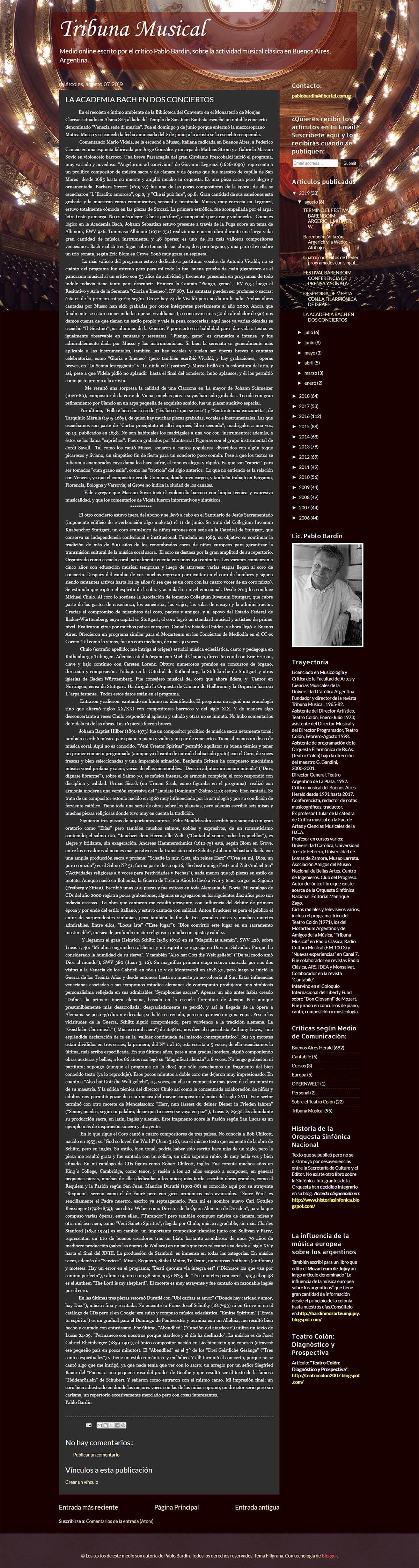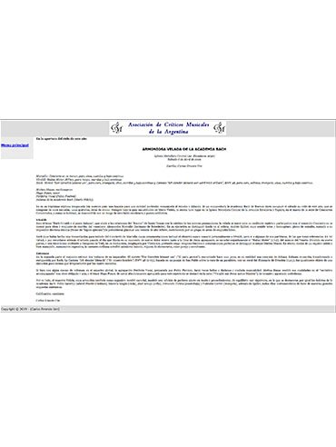 “Musso, muy correcta en Legrenzi, estuvo totalmente cómoda en las piezas de Strozzi. (…) "Piango, gemo" es dramática e intensa y fue admirablemente dada por Musso y los instrumentistas. (…) "Gloria e Imeneo" (…) Musso brilló en la coloratura del aria, y así, pese a que [Mario] Videla pidió no aplaudir hasta el final del concierto, hubo aplausos, y él los permitió como justo premio a la artista. (…) Por último, "Folle è ben che si crede ("Es loco el que se cree") y "Sentirete una canzonetta", de Tarquinio Mérula (1595-1665) (…) Tal como los cantó Musso, sonaron a cantos populares divertidos con algún toque picaresco y liviano; un simpático fin de fiesta para un concierto poco común.”