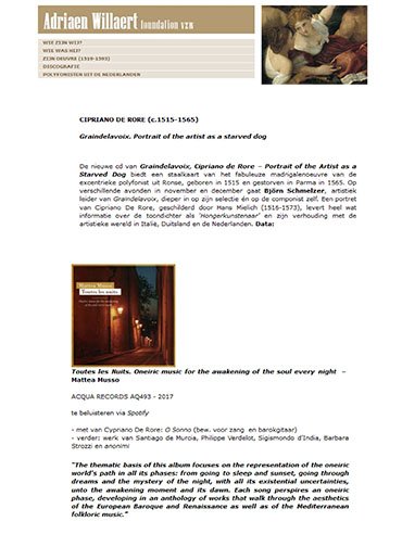 “L’interpretazione di Mattea Musso, dall’espressione delicata, bella vocalità e sottigliezza nei dettagli, è eccellente e capace di emozionare. La accompagnano Miguel de Olaso (liuti) e Hernán Cuadrado (viola da gamba), che danno con la loro arte e il loro sapere sostanziale apporto a questo lavoro dai risultati ammirevoli.”